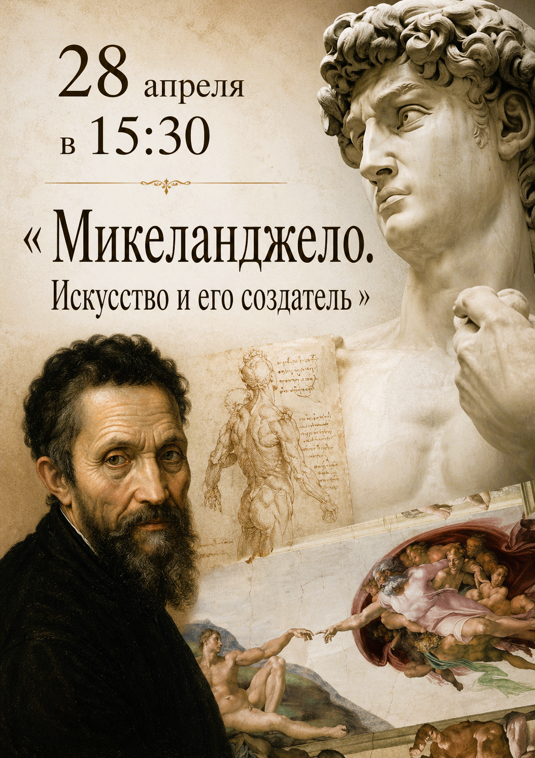 Дорогие друзья! Приглашаем вас на лекторий "Беседа об искусстве" на тему: "Микеланджело. Искусство и его создатель"