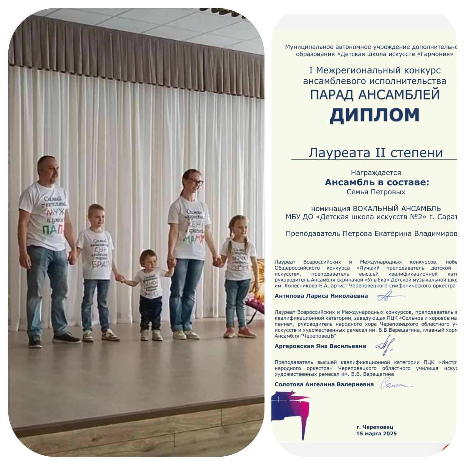 Подведены итоги I Межрегионального конкурса ансамблевого исполнительства "Парад ансамблей" в г. Череповце, в котором приняли участие обучающиеся и преподаватели Детской школы искусств № 2. Учредителем конкурса является Управление по делам культуры мэрии г. Череповца и муниципальное автономное учреждение дополнительного образования «Детская школа искусств «Гармония». По результатам конкурса ансамбль "ученик-учитель" в составе Петрова Елисея и Петровой Ю.В. (преподаватель Знатнина В.М.) были удостоены звания Лауреата I степени, а ансамбль в составе творческой семьи Петровых получили Диплом Лауреата II степени! Поздравляем! Мы гордимся нашими талантливыми участниками и их наставниками, продемонстрировавшими высокий уровень мастерства и артистизма. Участие в подобных конкурсах – это не только возможность заявить о себе, но и ценный опыт, способствующий профессиональному росту и обмену творческими идеями. | |